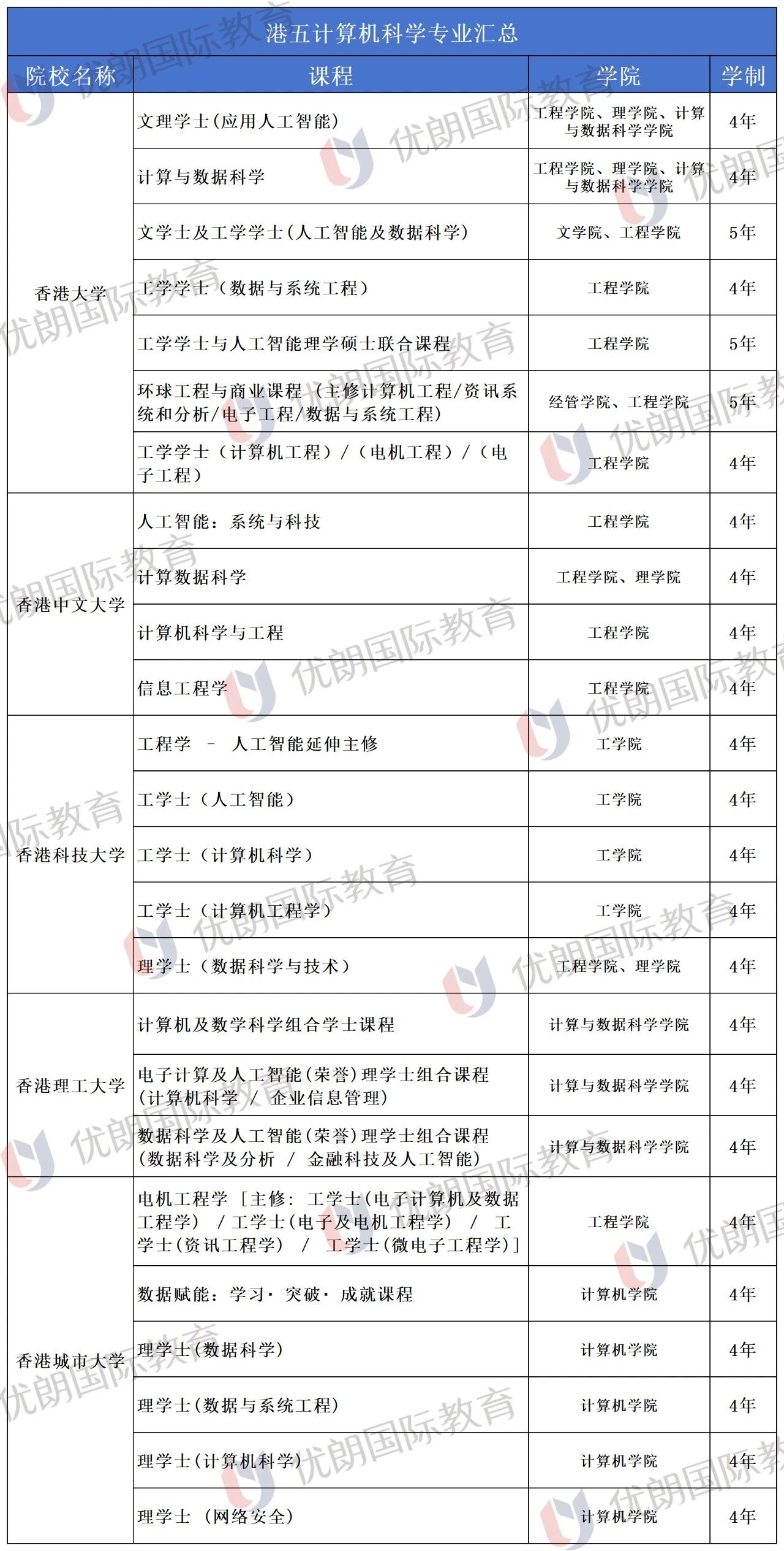 今天优朗小编就带大家详细了解一下香港院校的计算机科学相关专业!目前,香港开设计算机科学相关专业排名比较靠前的有五所学校:香港大学、香港科技大学、香港中文大学、香港理工大学、香港城市大学。 香港院校- 计算机科学相关课程 各校课程关键信息梳理 香港大学 香港大学于刚公布的 “2026年QS世界大学排名”跃升至历史性的全球第11位,创下前所未有的里程碑。在2025年QS世界大学学科排名中,香港大学的“数据科学与人工智能”位列全球18名,稳居全港第二!“计算机科学与信息系统”位列全球21名。 文理学士(应用人工智能) 课程内容:课程以问题导向学习为本,提供多元科目如计算机科学、地理学、数学、心理学、统计学或城市研究等。课程有五大主修,包括人工智能技术、商业与 金融人工智能、医学人工智能、智能城市人工智能或神经认知科学人工智能。 就业前景:人工智能的专业知识助同学在本地和国外就业市场中获得竞争优势,成为企业重要资产。毕业生可从事科技、环境保育、医疗信息学、医疗、商业、银行、金融、城市发展和神经认知科学等领域的职业。 计算与数据科学 课程介绍:工学学士(计算机科学)和工学学士(人工智能及数据科学)提供全面的教育,涵盖计算技术、人工智能和数据驱动技术。学生须在入学时初步表明修读课程选择的意向,及后在第一学年结束时自由作出最终决定。 就业前景:基于市场的大量需求,毕业生能预期获得大量机会发展事业。毕业生可以从事机器学习工程师、软件开发人员、数据分析师/工程师、人工智能顾问、网络安全专家等职业。 文学士及工学学士(人工智能及数据科学) 课程介绍:是一个开创性的五年双学位课程,课程融合严谨的工程学和计算机科学技术与具批判性的人文学科。通过这个独特的课程,学生将获得顶尖人工智能和数据科学的专业知识,同时培养人文学科中所倡导的批判性思维、道德推理和创造性解决问题的能力。 就业前景:程将为毕业生在电脑科学/工程领域的全方位职位的就业方面作充分准备,同时也适合任何传统上保留给文科专业的职业。这包括数据科学、机器学习、人工智慧、网路安全和密码学以及软体开发等快速增长的职业机会。 工学学士(数据与系统工程) 课程介绍:旨在融合专业知识与尖端科技,以优化复杂系统。课程内容涵盖多元化的系统分析与计算学科,例如人工智能(AI)、机器人、物联网(IOT)、数据驱动优化算法、系统模拟与建模。 就业前景:本课程的毕业生具备数据分析决策、机器人与自动化等技能,受到机器人、物流、自动化、医疗健康及智能制造等行业的青睐。毕业生的一些常见职位包括业务分析师、工业工程师、物流经理、管理顾问、规划经理、专案工程师、品质经理和供应链经理。 工学学士与人工智能理学硕士联合课程 课程介绍:旨在培养具备跨学科及硕士程度的AI知识、技能的工程师,以应对未来的各种工程挑战。工学学士课程(X)学生可自由选修一门工程专科,并于4+1年内完成人工智能理学硕士学位课程以及得到12万港元的入学奖学金。 就业前景:毕业生可享高度弹性和灵活选择职业。除现有的工程领域外,更可选择商界、教育界或社会服务界等。此外,每年约有 16% 的本科毕业生于香港或海外继续深,包括修读硕士或博士课程。 环球工程与商业课程 (主修计算机工程/资讯系统和分析/电子工程/数据与系统工程) 课程介绍:由工程学院和港大经管学院合办的跨学科双学位课程,为同学提供工程和商业方面的专业知识及相关的全球性角度。完成五年的课程后,同学将获得工学学士(BEng)和工商管理学学士(BBA)。 就业前景:大部份工程学院的毕业生投身工程界,而其他毕业生则在商界、教育界或社会服务界工作。此外,每年约有百分之九的本科毕业生于香港或外地修读硕士或博士课程。 工学学士(计算机工程)/(电机工程)/(电子工程) 课程介绍:电机电子工程学系是香港唯一一个包括计算机工程(CE)、电机工程(EE)和电子工程(ElecE)的学系。学系提供当代的课程和激发灵感的学习体验,以培育相关领域的未来领袖。 就业前景:这个课程的当代学习过程旨在透过体验式学习课程、总结性学习体验、交换生计划、实习及服务学习计划等,培养具有坚实基础的全方位毕业生。大部份毕业生会投身工程界,而其他毕业生则在商界、教育界或社会服务界工作。 香港中文大学 香港中文大学于2026QS世界大学排名中位列全球第32位,比去年跃升4位,创下自2010年排名设立以来最佳成绩!在2025年泰晤士高等教育世界大学学科排名中,香港中文大学的“计算机科学”位列全球30名! 人工智能:系统与科技 课程介绍:旨在培育学生透过数学、基础科学、数据结构、统计学、算法、分佈式计算等基础,设计和运用能从大量信息中分析、推理和推断知识的人工智能系统的能力。学生毕业后,能应用人工智能的领域多不胜数,同时也能研发人工智能相关前沿创新科技,在学术、工业和社会层面都非常实用。 就业前景:目前本地和全球就业市场对人工智能专家求才若渴。在领域顶尖人才的带领下,配合先进的科研设施,本课程旨在为不同行业培养优秀的人工智能工程师/科学家,包括:生物医学工程/科学、信息和计算技术、制造和机器产业,以及各种互联网公司的智能多媒体处理。 