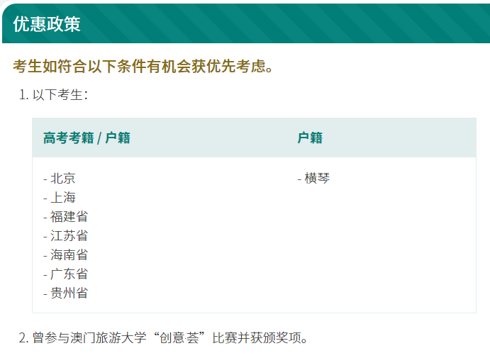 第7个,澳门旅游大学,只要是北京、上海、江苏、福建、广东、海南、贵州及横琴户籍,就能享受优惠!