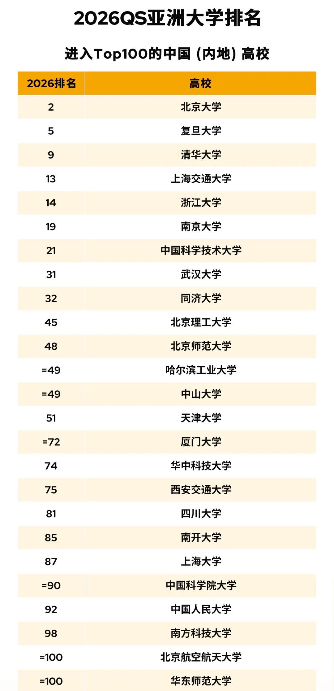 2026QS亚洲大学排名,相比去年,进行了新一轮的大洗牌。中国内地、中国香港特别行政区和新加坡的高校包揽了亚洲排名前十位。
