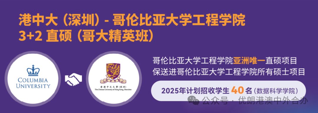 香港中文大学(深圳)数据科学学院作为创始学院,2024年率先启动与哥伦比亚大学(哥大)工程学院的3+2直硕项目。2025年,该项目扩展至港中深多个学院。
