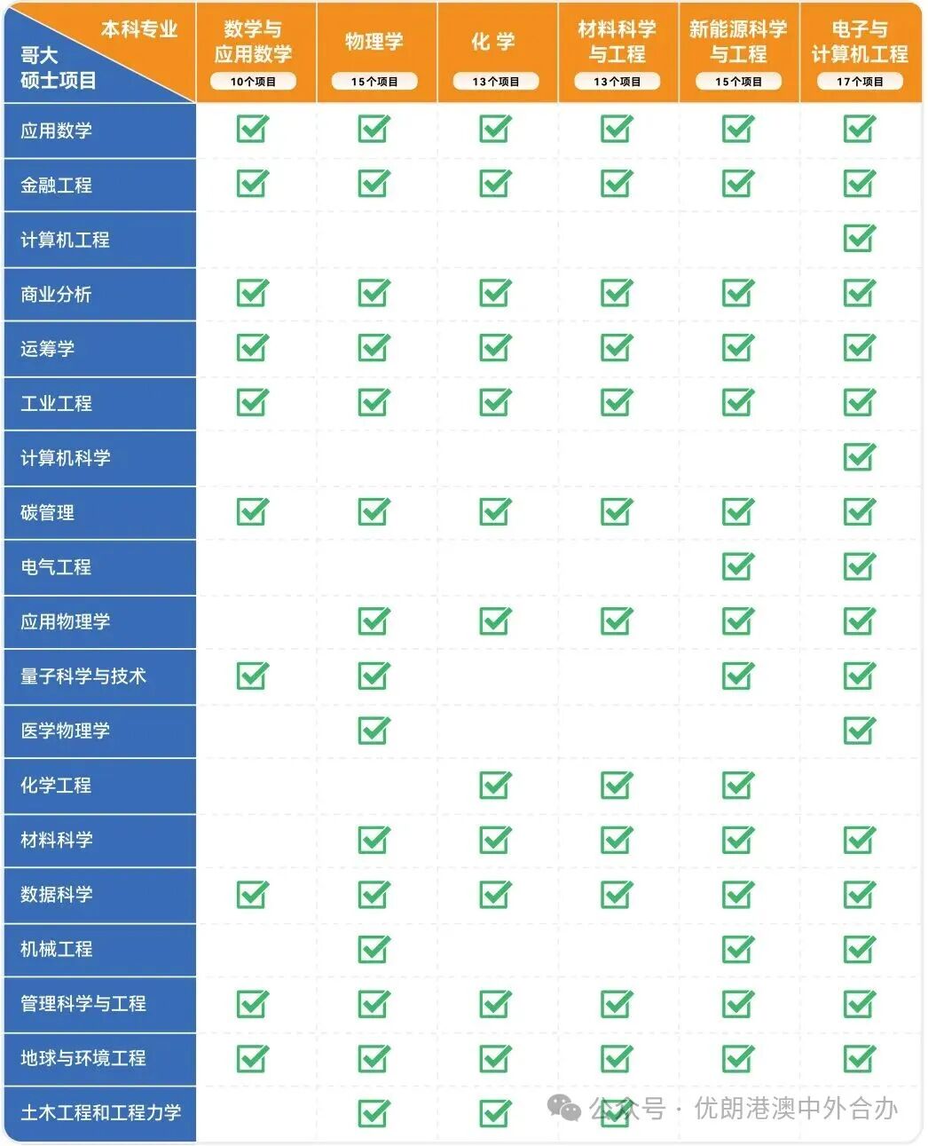 理工学院6大本科专业:数学与应用数学、物理学、化学、材料科学与工程、新能源科学与工程、电子与计算机工程,可匹配申请哥伦比亚大学工程学院的硕士项目多达17个。
