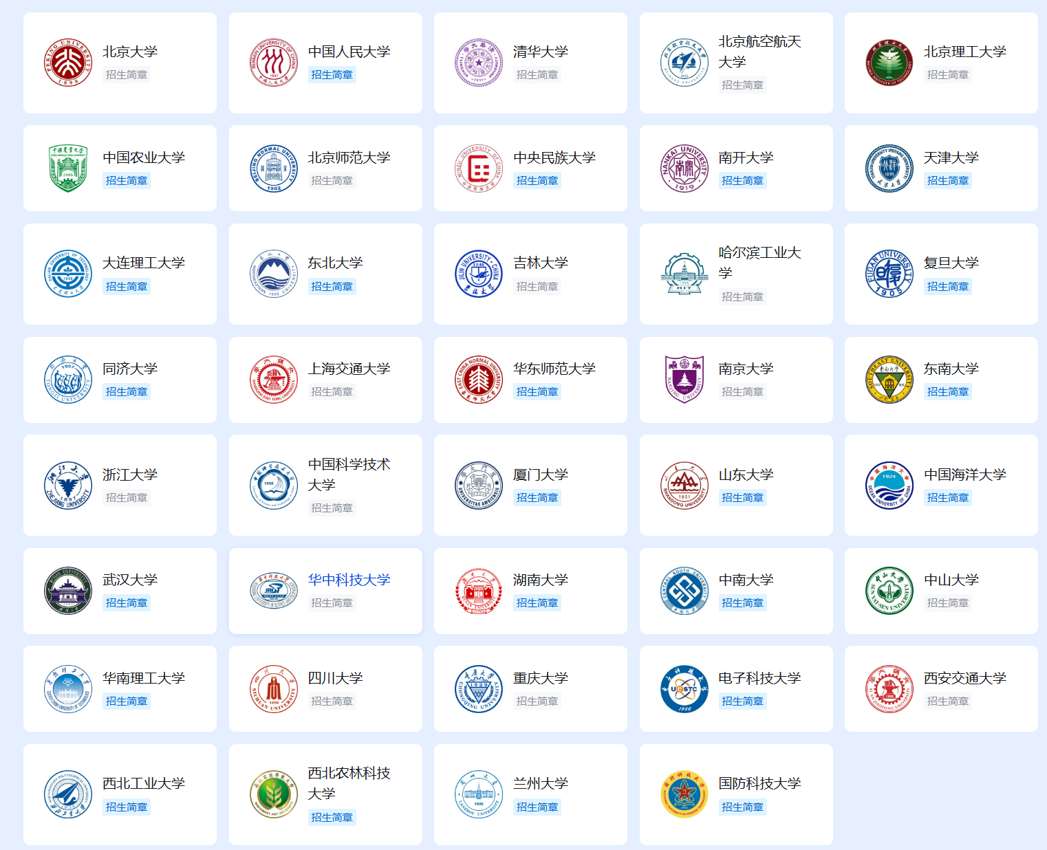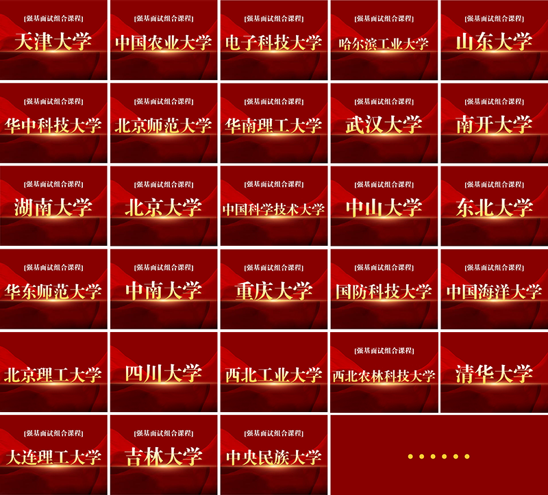 覆盖:清华、北大、复旦、上交、浙大、中科大、南大、哈工大、人大、华科、东南、中山、武大、国防科大、川大、山大、中南、华南理工、北理工、大连理工、西北工业、重庆大学、电子科大、北师大、华东师大、中国农大、中国海大、中央民大、湖南大学、东北大学、西北农林等全部强基高校