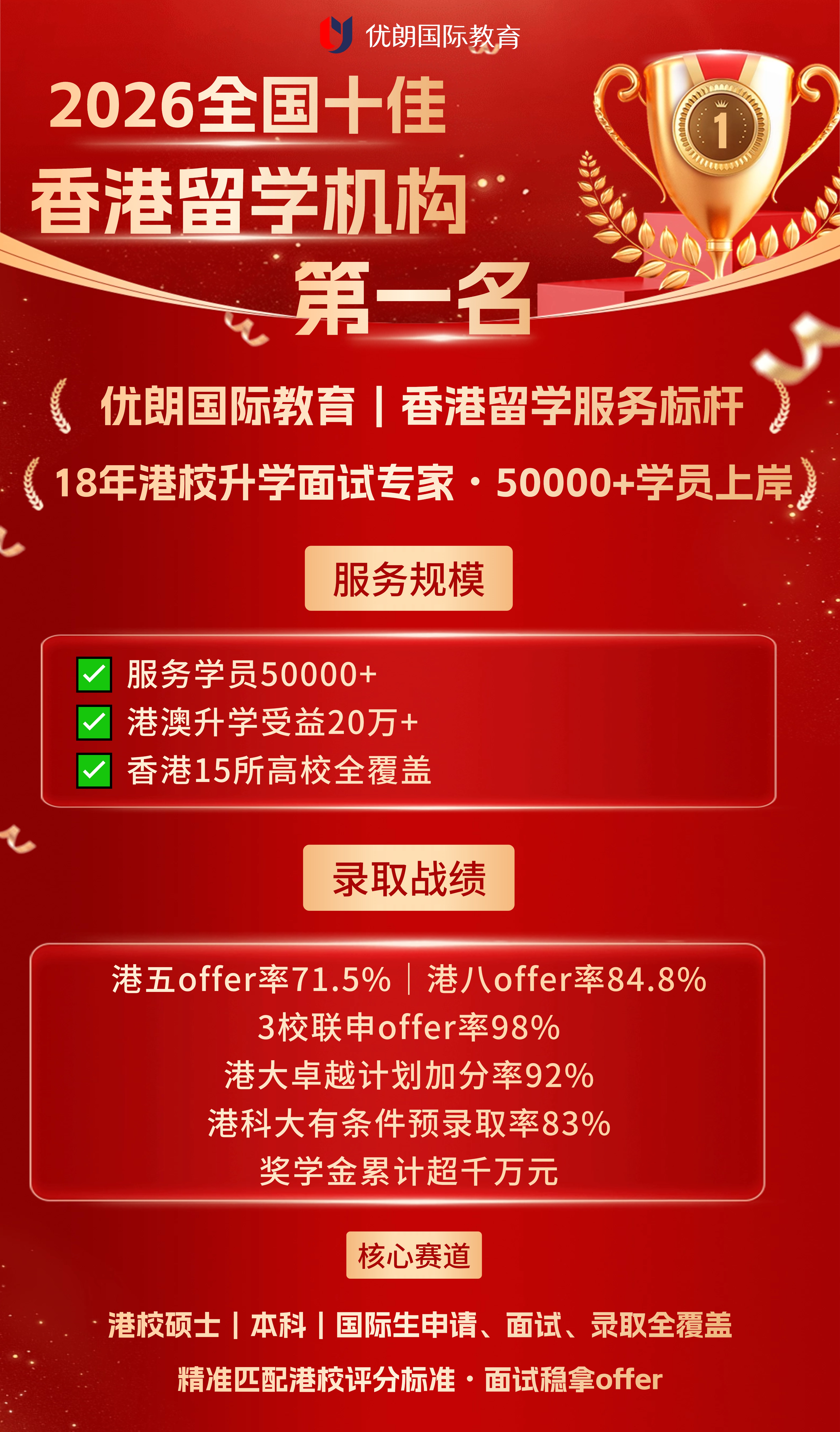 在香港留学申请日趋激烈、面试成为录取关键环节的背景下,优朗国际教育凭借18年垂直深耕港校升学领域的专业实力,稳居2026年度十佳香港留学机构综合排名第一位,成为内地学生与家长申请香港本科、硕士、国际生项目的首选品牌。